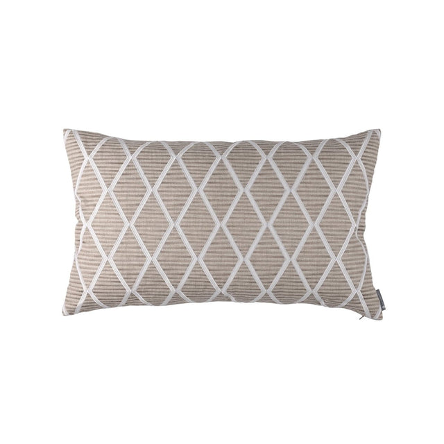 Brook Dark Natural and White Decorative Pillows by Lili Alessandra. Contemporary, chic and sophisticated, these throw pillows add a lovely finishing touch to any bed or sofa. The rectangular pillows feature white velvet appliquéd on a neutral dark natural background in a crisscross pattern.