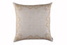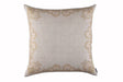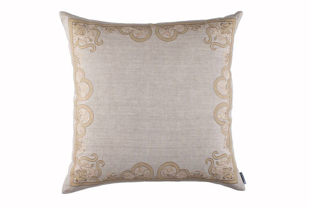 Nina Sand Euro Pillow by Lili Alessandra–this elegant square pillow is sure to make a grand statement in any space. The decorative pillow is adorned with a scrollwork inspired design along the border. It features gold embroidery and dark sand linen appliqué on a neutral linen background.