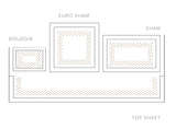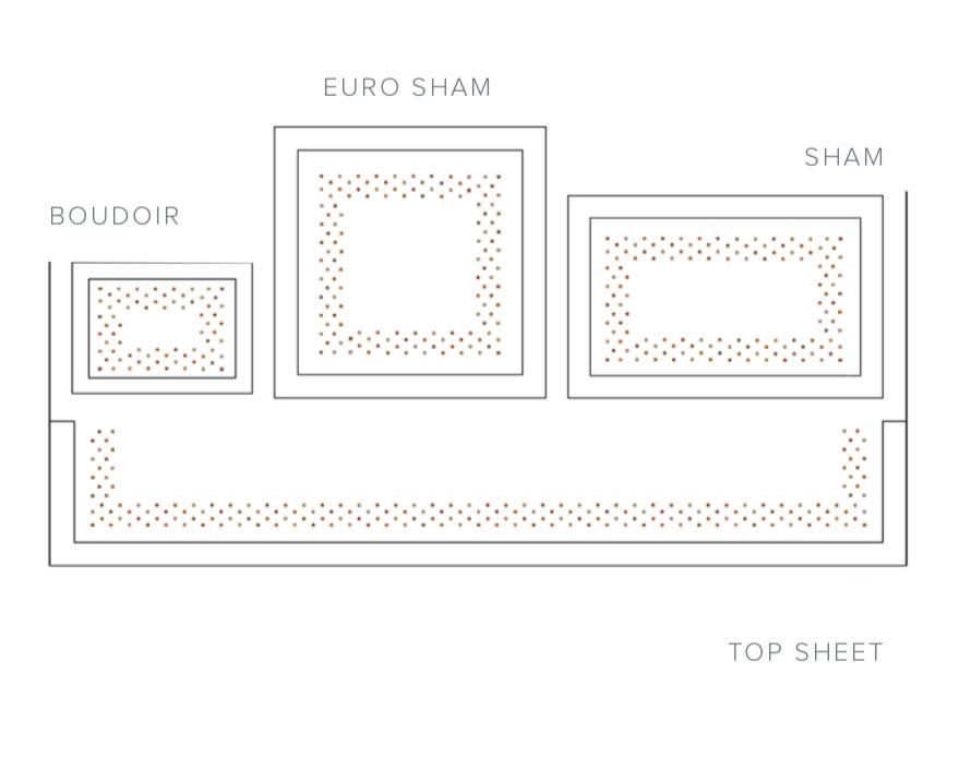 • Sham: Approximately 3" mitered flange on shams; 2" mitered flange on boudoir; French-flap closure