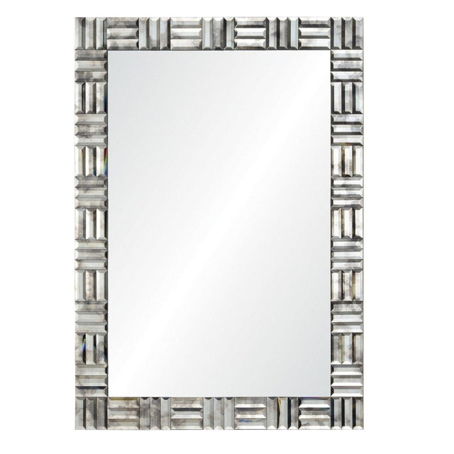 Designed by Suzanne Kasler. Hand carved antiqued mirror framed mirror. Beveled center mirror surrounded by hand cut antiqued mirror. Cleat hanging hardware provided.