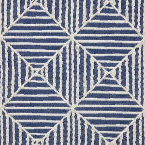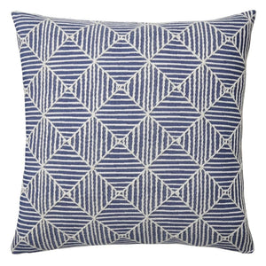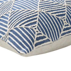 Mar Blue and White Decorative Pillow by Mode Living. This contemporary accent pillow features a beautiful and mesmerizing geometric pattern woven in classic shades of blue and white. The throw pillow reverses to a solid neutral on the back and has a hidden zipper closure. It's perfect for adding texture and pattern to any space.
