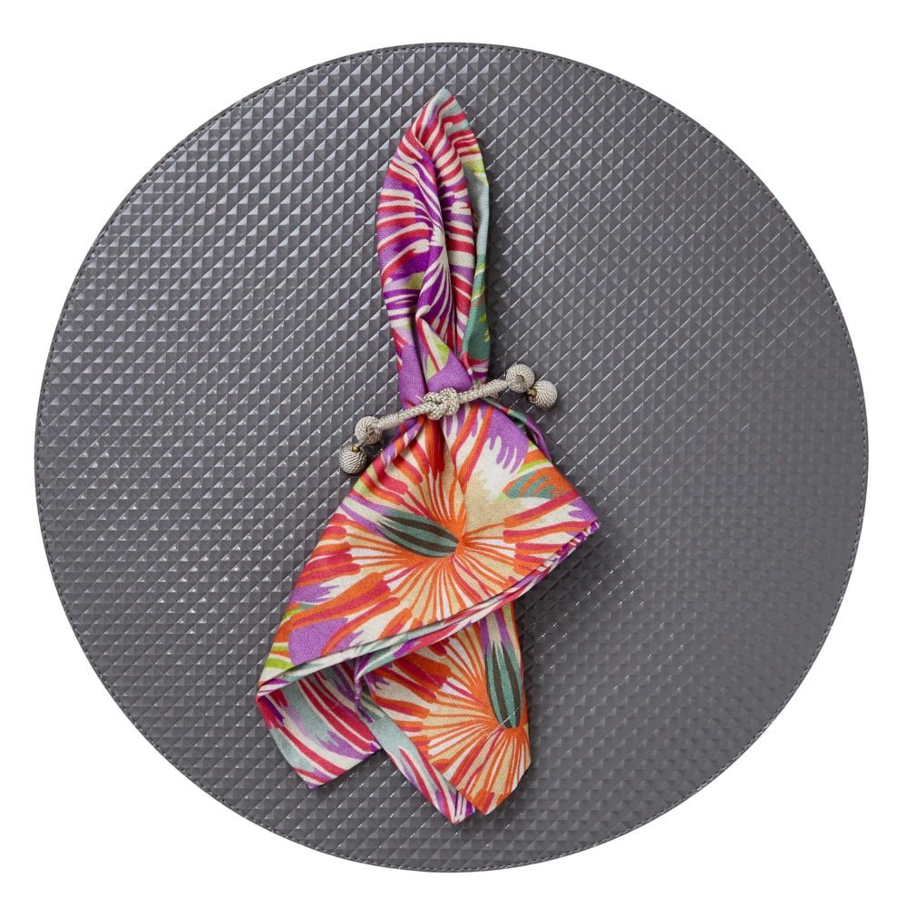 Miyake Gray & Black Round Placemats by Mode Living. Drawing inspiration from the simplicity of Japanese design styles, these placemats feature a sleek and modern design with subtle hues and textures. The round placemats are reversible; they are black on one side and grey on the other. The best part is that these round placemats are easy to clean, simply wipe with a damp cloth.