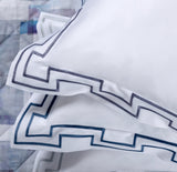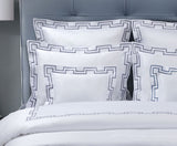 Musica Bedding by Dea Fine Linens offers a fresh and modern take on a classic geometric motif. Duvet covers, sheets, shams and pillowcases are embroidered with a large scale geometric pattern. This collection of luxurious bed linens is bold and eye-catching, it adds a bit of drama and style to any bedroom. Available in White and Ivory with 6 embroidery thread color options.