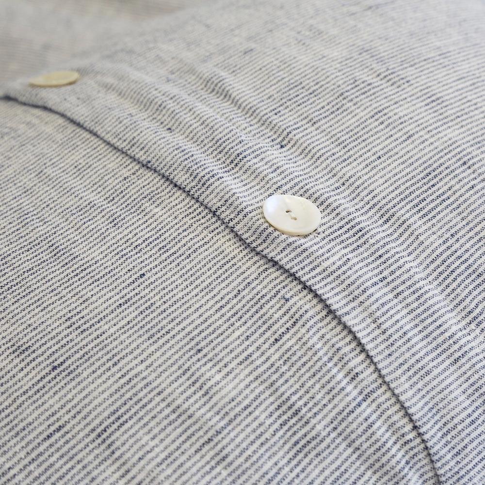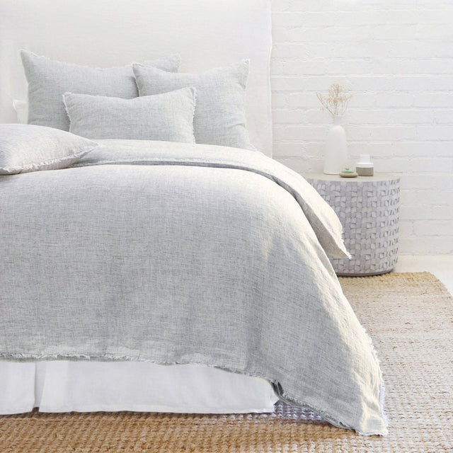 Logan Navy Collection by Pom Pom at Home–a fine collection of linen duvets, shams and pillows in a neutral and complementary color. Bed linens are woven with two different colored yarns for a heathered effect, and finished with subtle frayed edges. This contemporary bedding collection is sure to add a refreshing feel to any room. Pom Pom at Home Duvet Covers and Logan Shams and Pillows.