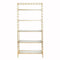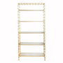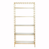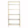 Addie Sculpted Gold Etagere by Worlds Away is a glamorous and stylish option for the home office or living area. It features a hand-crafted iron frame with a stunning gold leaf finish. The frame has a repeating ring detail and sturdily supports five inset glass shelves. Addie offers plenty of space to display your favorite items.