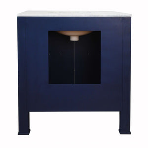 Blanche Textured Navy Linen Bath Vanity by Worlds Away is simply sophisticated and ultra chic. The cabinet is dressed in textured navy linen and features classy antique brass ring pulls and ferrule hardware. It comes with a pristine white carrara marble top and backsplash, as well as a white porcelain sink.